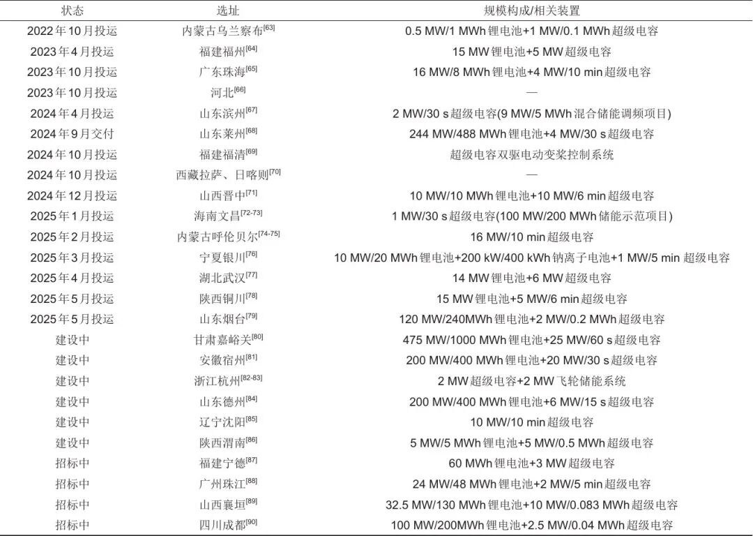 考慮合適的控制策略與容量配置方法,超級電容已逐漸成為電力系統(tǒng)調(diào)頻的關鍵技術(shù)。具體來說,通過考慮超級電容與電源、負荷的互動,將超級電容集成到原有電力系統(tǒng)中,不僅可以平衡能源之間的間歇性,還可以提供即時的能量支撐,增強電力系統(tǒng)的可靠性。目前,超級電容輔助電力系統(tǒng)調(diào)頻已有大量工程案例,其中,已投運、建設中以及投標中的部分典型工程案例見表3。