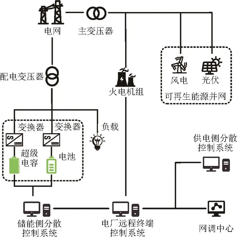 除作為獨立單元應用于儲能調(diào)頻系統(tǒng)外,超級電容更常以混合儲能系統(tǒng)中的核心組件形式存在,其典型應用模式為與鋰電池構(gòu)成混合儲能調(diào)頻系統(tǒng)。此類系統(tǒng)能夠快速充放電并精準調(diào)節(jié)輸出功率,調(diào)頻效果遠好于常規(guī)發(fā)電機組。其系統(tǒng)結(jié)構(gòu)如圖1所示,電源側(cè)整合火電與可再生能源形成互補發(fā)電體系;儲能側(cè)通過混合儲能調(diào)頻系統(tǒng)經(jīng)變換器實現(xiàn)能量雙向流動;控制系統(tǒng)涵蓋電廠遠端、儲能就地控制及網(wǎng)調(diào)中心三級管理模塊,實現(xiàn)“源、網(wǎng)、荷、儲”協(xié)調(diào)控制,體現(xiàn)出混合儲能調(diào)頻系統(tǒng)在新型電力系統(tǒng)中的協(xié)同調(diào)頻機制。