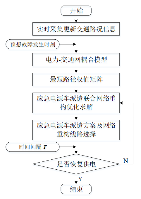 首先,實時采集并更新在交通事故等事件影響下的交通路況信息;其次,在電網(wǎng)預(yù)想故障發(fā)生時刻,根據(jù)該時刻的交通路況信息進行最短路徑權(quán)值矩陣的計算;接著根據(jù)最短路徑權(quán)值矩陣進行故障預(yù)案模型的優(yōu)化求解,得到應(yīng)急電源車的派遣方案及網(wǎng)絡(luò)重構(gòu)的線路選擇;最后,根據(jù)固定的時間間隔,更新調(diào)整應(yīng)急電源車派遣及網(wǎng)絡(luò)重構(gòu)的恢復策略,直至電網(wǎng)恢復供電。如下圖所示。