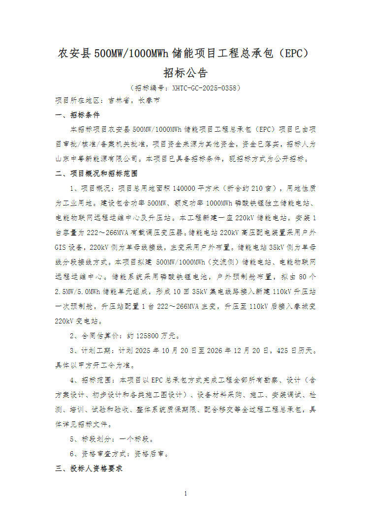 中國(guó)儲(chǔ)能網(wǎng)訊:9月1日,農(nóng)安縣500MW/1000MWh儲(chǔ)能項(xiàng)目工程總承包(EPC)招標(biāo)公告發(fā)布。