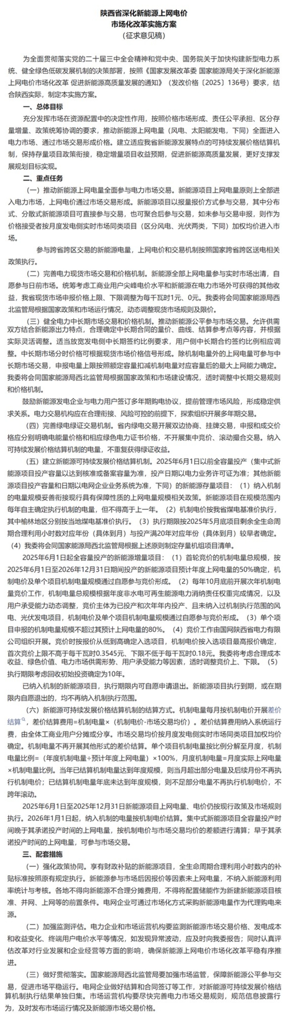 中國(guó)儲(chǔ)能網(wǎng)訊:9月3日,陜西省發(fā)改委一紙公告點(diǎn)燃新能源市場(chǎng)——《陜西省深化新能源上網(wǎng)電價(jià)市場(chǎng)化改革實(shí)施方案(征求意見(jiàn)稿)》的發(fā)布,不僅標(biāo)志著陜西新能源全面入市的改革大幕正式拉開(kāi),更以“配儲(chǔ)非前置條件”“增量項(xiàng)目競(jìng)價(jià)定電價(jià)”“現(xiàn)貨市場(chǎng)限價(jià)動(dòng)態(tài)調(diào)整”三大核心舉措,為儲(chǔ)能行業(yè)撕開(kāi)了一條從政策依賴(lài)向市場(chǎng)驅(qū)動(dòng)轉(zhuǎn)型的突圍之路。