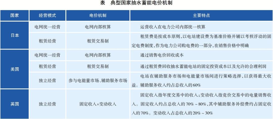 現(xiàn)階段,日本抽水蓄能電站主要采用租賃制(電源開發(fā)商參與)和內(nèi)部核算制(電力公司主導(dǎo));美國則以電網(wǎng)統(tǒng)一運(yùn)營模式為主(抽蓄電站約占70%),輔以租賃運(yùn)營和少量獨(dú)立運(yùn)營,直接參與電力市場的比例較低;英國抽水蓄能電站雖然總體規(guī)模有限,但其高度市場化的發(fā)電側(cè)環(huán)境使其能夠作為獨(dú)立成員參與市場,其收入明確區(qū)分為年度交易的固定收入與競價交易的變動收入兩部分,構(gòu)成典型的兩部制電價模式(見表)。