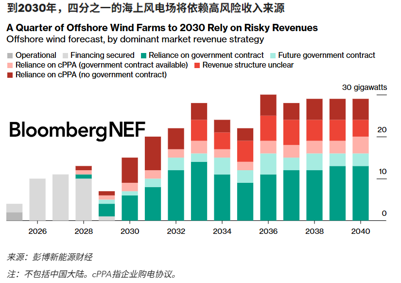 彭博新能源財(cái)經(jīng)預(yù)計(jì),本十年將并網(wǎng)的海上風(fēng)電裝機(jī)容量中,四分之一將依賴風(fēng)險(xiǎn)較高的企業(yè)購電協(xié)議或不確定的收入策略。2031-2040年,這一比例將升至總裝機(jī)容量的近一半。