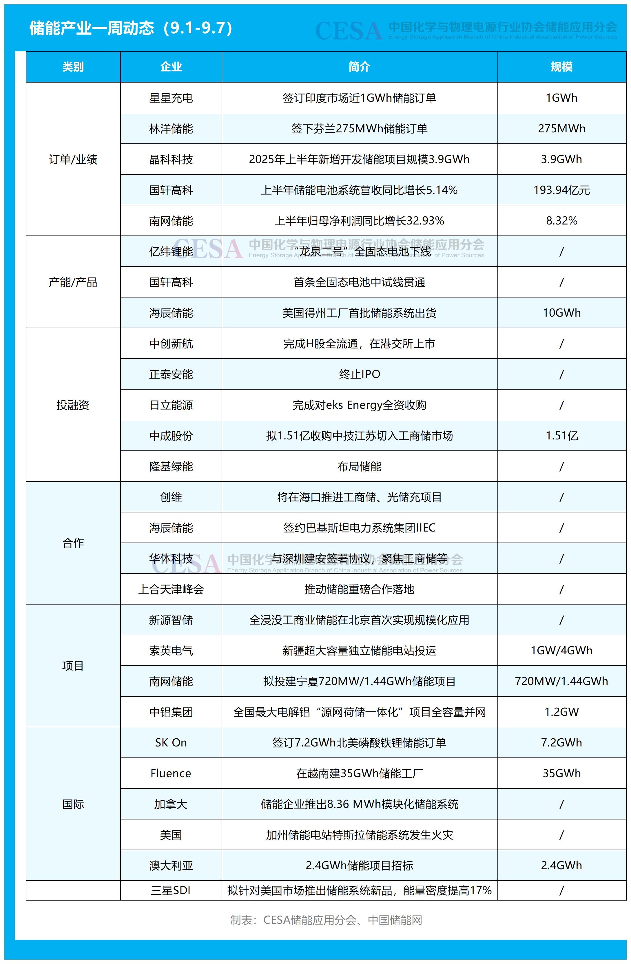 訂單/業(yè)績方面,星星充電拿下印度市場近1GWh儲能大單;林洋儲能簽下芬蘭275MWh儲能訂單;晶科科技2025年上半年新增開發(fā)儲能項目規(guī)模3.9GWh;國軒高科上半年儲能電池系統(tǒng)營收同比增長5.14%;南網(wǎng)儲能上半年歸母凈利潤同比增長32.93%。