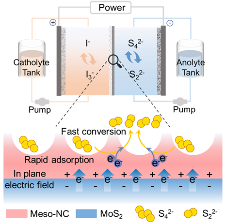 基于此,陳嘉嘉教授課題組設(shè)計(jì)出一種具有三明治狀納米結(jié)構(gòu)的二維有序介孔氮摻雜碳復(fù)合二硫化鉬(Meso-NC@MoS2)異質(zhì)結(jié),以促進(jìn)多硫化物的吸附并加速其緩慢的動(dòng)力學(xué)。理論計(jì)算證實(shí),MoS2和Meso-NC之間建立的定向電子傳輸通道加速了電子從Meso-NC@MoS2向S42-的轉(zhuǎn)移,有效促進(jìn)S42-解離并形成低階多硫化物。基礎(chǔ)電化學(xué)測(cè)試表明,在Meso-NC@MoS2電極上,水系多硫化物展現(xiàn)出最大反應(yīng)動(dòng)力學(xué)活性(反應(yīng)速率常數(shù)提升3.2倍)與最小峰電位差(ΔEp降低至0.21 V),突顯了卓越的催化活性與反應(yīng)可逆性。相較于純碳?xì)蛛姌O,基于Meso-NC@MoS2的水系多硫化物液流電池充電過(guò)電位顯著降低約377 mV,并有效削弱電池極化。該電池在30天內(nèi)連續(xù)運(yùn)行3200次循環(huán)后,仍保持112 mW cm-2的峰值功率密度及99.9%的庫(kù)倫效率。