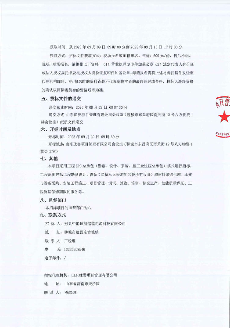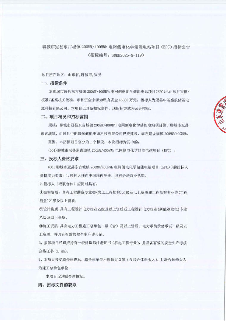 中國儲能網(wǎng)訊:9月8日,冠縣中能盛航儲能電源科技有限公司發(fā)布聊城市冠縣東古城鎮(zhèn)200MW/400MWh電網(wǎng)側(cè)電化學(xué)儲能電站項(xiàng)目(EPC)招標(biāo)公告。項(xiàng)目位于山東省聊城市冠縣東古城鎮(zhèn),規(guī)劃建設(shè)規(guī)模200MW/400MWh。本次采購需求為EPC總承包。