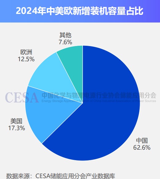 在政策驅(qū)動下,儲能市場正經(jīng)歷從“規(guī)模擴(kuò)張”向“智能升級”的關(guān)鍵轉(zhuǎn)型。據(jù)國際能源署(IEA)及CESA 儲能應(yīng)用分會產(chǎn)業(yè)數(shù)據(jù)庫統(tǒng)計(jì),2024年全球新型儲能市場新增裝機(jī)規(guī)模為74.2GW/175GWh,同比+52.67%/+69.08%,中國、美國、歐洲三大市場裝機(jī)占比在90%以上, 中國新增裝機(jī)占比超過60%。
