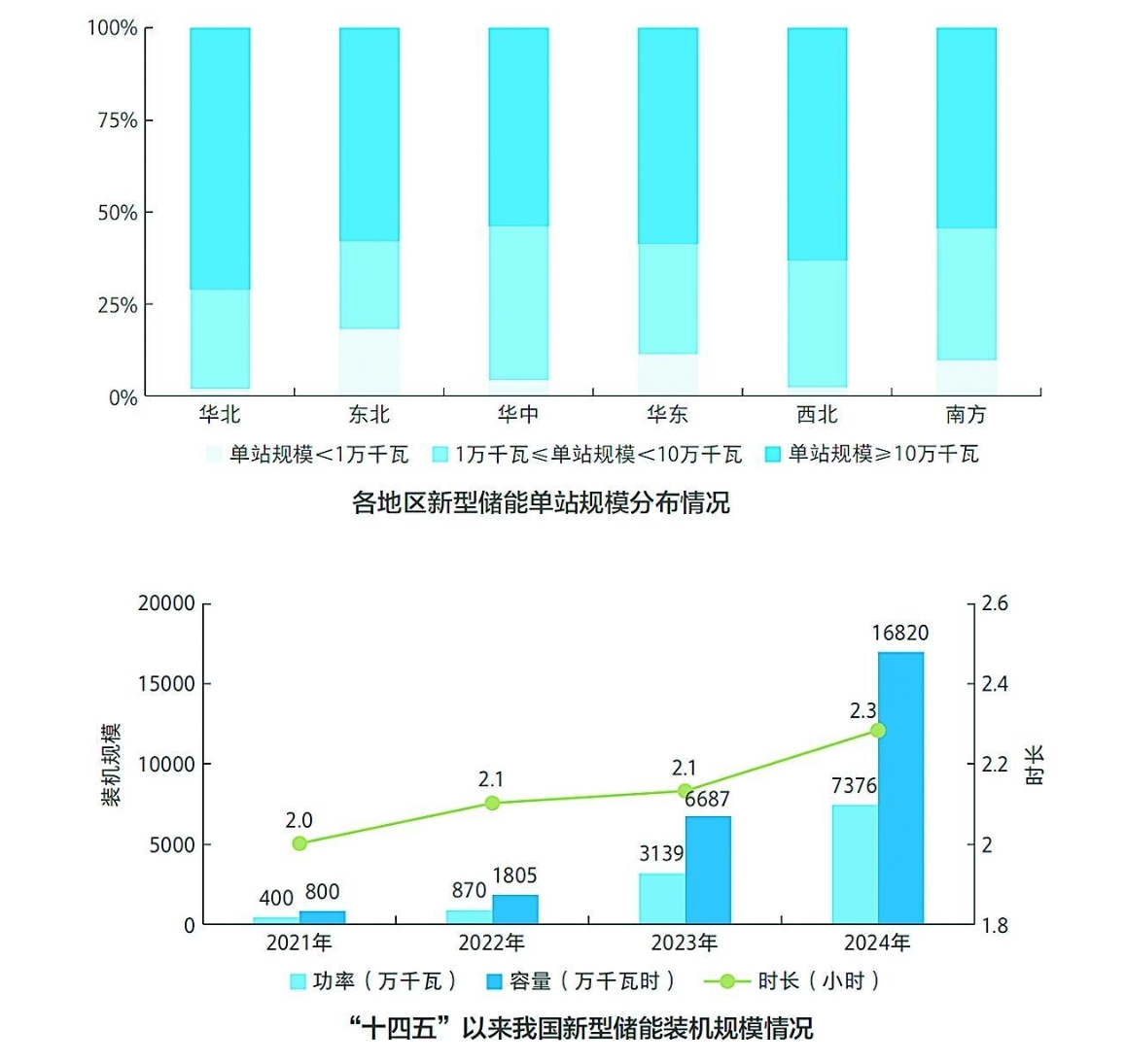 新型儲能裝機規(guī)模連年翻番。截至2024年底,全國已建成投運新型儲能項目累計裝機規(guī)模達7376萬千瓦/1.68億千瓦時,約為“十三五”末的20倍,較2023年底增長超過130%,2024年新增新型儲能裝機4237萬千瓦/1.01億千瓦時。全國新型儲能平均儲能時長2.3小時,較2023年底增加約0.2小時,“十四五”以來儲能時長呈上升趨勢。