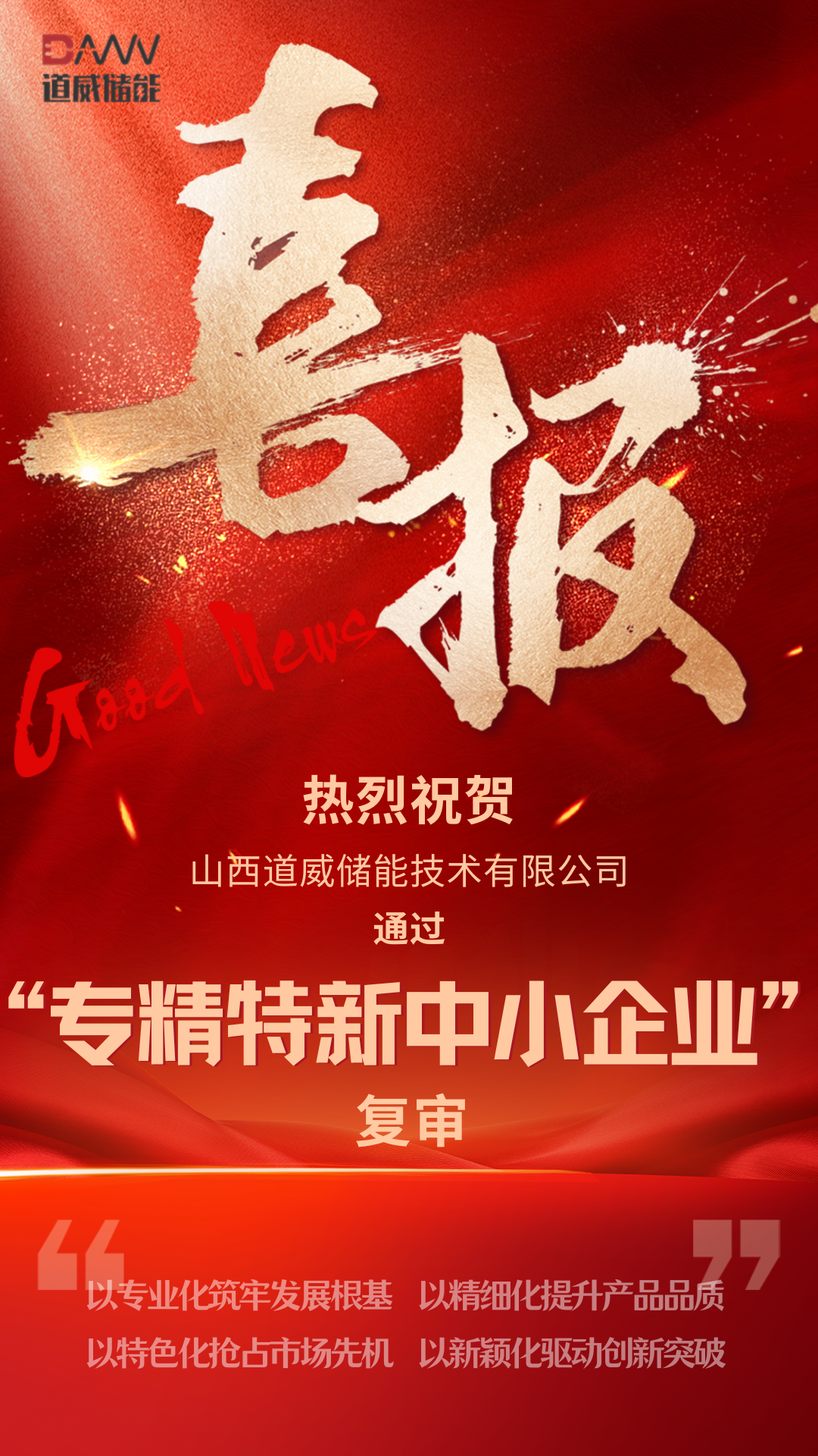 在山西省工業(yè)和信息化廳組織開展的 2025 年專精特新中小企業(yè)復(fù)審工作中,北京道威儲能集團有限公司旗下全資子公司 —— 山西道威儲能技術(shù)有限公司,憑借扎實過硬的專業(yè)實力、亮眼突出的創(chuàng)新成果與穩(wěn)健向好的發(fā)展態(tài)勢,歷經(jīng)材料嚴(yán)苛審核、實地細(xì)致核查、專家綜合評審等多輪嚴(yán)格篩選,成功通過此次復(fù)審,繼續(xù)保有 “專精特新中小企業(yè)” 榮譽稱號!這既是對道威儲能發(fā)展成果的權(quán)威認(rèn)可,更是我省培育優(yōu)質(zhì)中小企業(yè)的生動實踐。