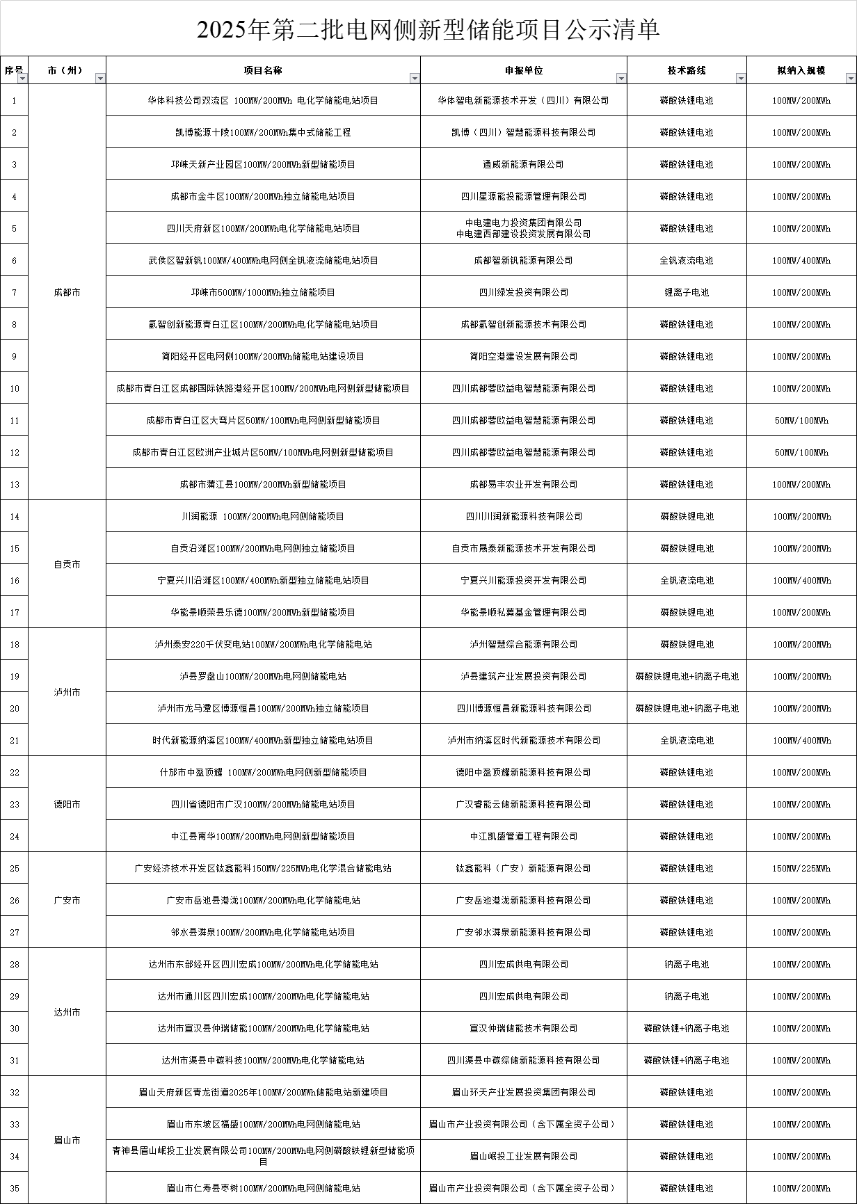 根據(jù)《關(guān)于開展2025年第二批電網(wǎng)側(cè)新型儲(chǔ)能項(xiàng)目申報(bào)工作的通知》要求,本次納入清單項(xiàng)目原則上在成都、自貢、瀘州、德陽、內(nèi)江、宜賓、廣安、達(dá)州8個(gè)迎峰度夏期間有電力缺口或局部供電卡口的區(qū)域,因眉山電網(wǎng)直接嵌入成都立體雙環(huán)網(wǎng),在該區(qū)域建設(shè)新型儲(chǔ)能項(xiàng)目能夠有效支撐成都電網(wǎng)安全穩(wěn)定運(yùn)行,故一并納入。經(jīng)相關(guān)市推薦和專家評(píng)估論證,擬將“華體科技公司雙流區(qū)100MW/200MWh電化學(xué)儲(chǔ)能電站”等35個(gè)項(xiàng)目納入新型儲(chǔ)能項(xiàng)目清單,現(xiàn)予以公示。項(xiàng)目正式納入清單后,將按照市場(chǎng)化方式推動(dòng)項(xiàng)目實(shí)施,相關(guān)市能源行業(yè)主管部門和電網(wǎng)企業(yè)做好協(xié)調(diào)保障工作。