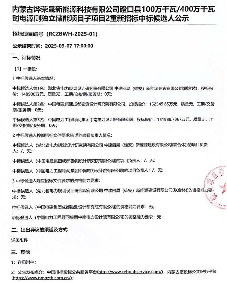 中國儲能網(wǎng)訊:9月5日,內(nèi)蒙古燁榮晟新能源科技有限公司磴口縣100萬千瓦/400萬千瓦時電源側獨立儲能項目子項目2重新招標中標候選人公示發(fā)布。