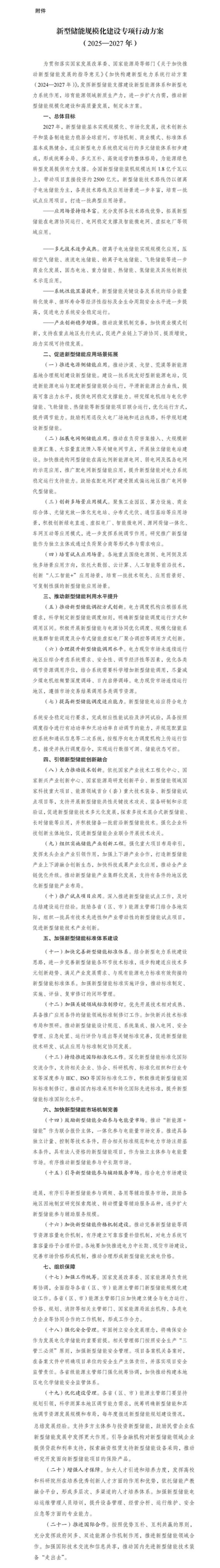 中國(guó)儲(chǔ)能網(wǎng)訊:9月12日,國(guó)家發(fā)展改革委、國(guó)家能源局正式印發(fā)《新型儲(chǔ)能規(guī)?;ㄔO(shè)專項(xiàng)行動(dòng)方案(2025—2027年)》,明確提出到2027年,全國(guó)新型儲(chǔ)能裝機(jī)規(guī)模達(dá)到1.8億千瓦以上,帶動(dòng)項(xiàng)目直接投資約2500億元,基本實(shí)現(xiàn)新型儲(chǔ)能的規(guī)?;⑹袌?chǎng)化發(fā)展。這一政策被視為推動(dòng)我國(guó)能源結(jié)構(gòu)綠色轉(zhuǎn)型、構(gòu)建新型電力系統(tǒng)的關(guān)鍵舉措,將對(duì)儲(chǔ)能產(chǎn)業(yè)乃至整個(gè)能源行業(yè)帶來(lái)深遠(yuǎn)影響。