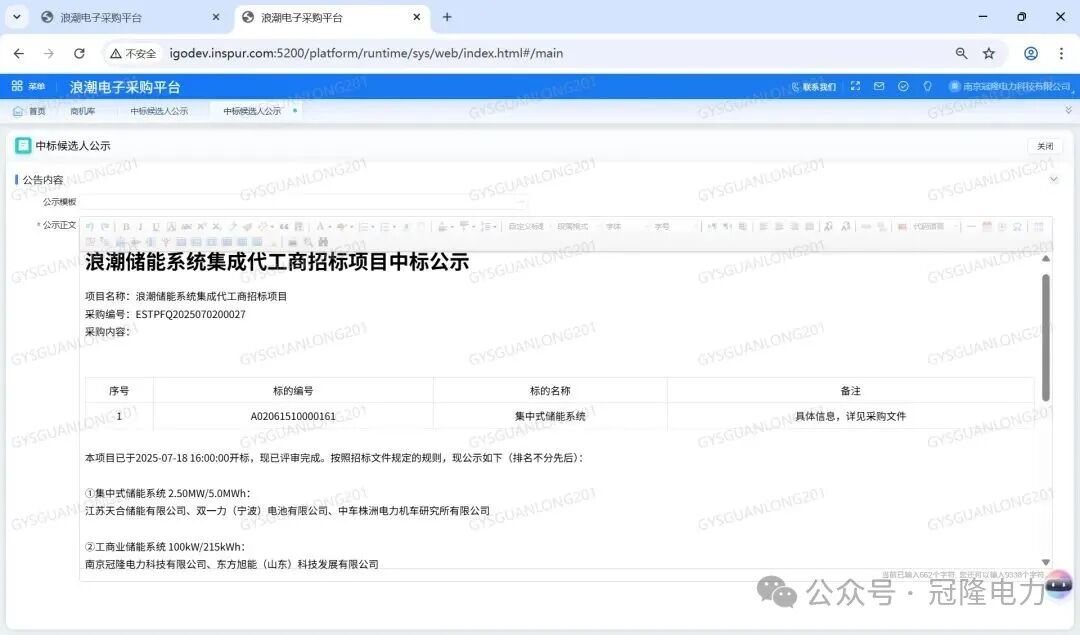 中國儲能網訊:近日,浪潮集團正式公布了總規(guī)模400MWH—2GWH儲能系統集成代工商的招標結果,南京冠隆電力科技有限公司憑借深厚技術積淀與行業(yè)口碑,強勢中標100kW/215kWh、100kW/233kWh工商業(yè)儲能系統標段。