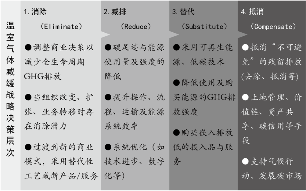 在制定零碳路線圖(Decarbonization Roadmap)方面,國(guó)際環(huán)境管理與評(píng)價(jià)協(xié)會(huì)(IEMA)提出的排放減緩/減少的層次分析結(jié)構(gòu),可指導(dǎo)產(chǎn)業(yè)、園區(qū)以及利益相關(guān)者制定脫碳戰(zhàn)略。這為決策者提供了一種結(jié)構(gòu)化的分析與評(píng)估方法,可綜合考慮脫碳目的、預(yù)算、風(fēng)險(xiǎn)與場(chǎng)地限制等因素。