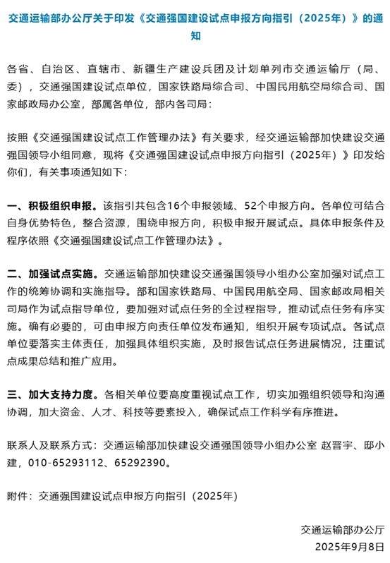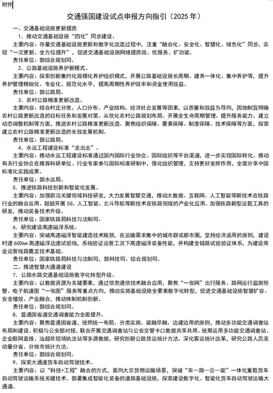 中國儲能網(wǎng)訊:2025年9月12日,交通運輸部辦公廳正式發(fā)布《交通強國建設(shè)試點申報方向指引(2025年)》,文件錨定交通領(lǐng)域高質(zhì)量發(fā)展新坐標。其中,“源—網(wǎng)—荷—儲—充”一體化項目的系統(tǒng)性規(guī)劃,成為本次指引的亮點之一。