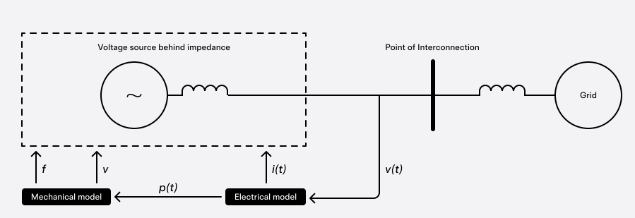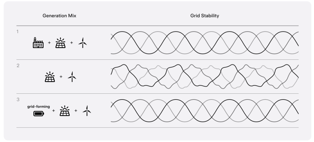 構(gòu)網(wǎng)對電網(wǎng)穩(wěn)定性的貢獻很像汽車的減震器——它能抑制波動并保持平穩(wěn)運行,即使在擾動期間也是如此。正如沒有減震器的車輛可能會失控一樣,沒有適當(dāng)阻尼的電網(wǎng)可能會經(jīng)歷停電。傳統(tǒng)上,基于化石燃料的同步發(fā)電機通過使用機械慣性和旋轉(zhuǎn)能量來穩(wěn)定電壓和頻率,從而執(zhí)行此構(gòu)網(wǎng)功能。構(gòu)網(wǎng)逆變器可以通過獨立建立和調(diào)節(jié)電網(wǎng)電壓和頻率,并亞周期響應(yīng)以抵消電網(wǎng)擾動,來實現(xiàn)相同的穩(wěn)定功能。