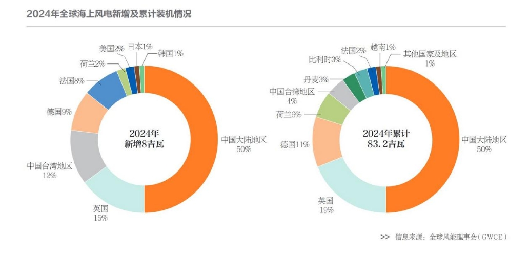 同時(shí),全球海上風(fēng)電市場(chǎng)也迎來高速增長(zhǎng)。全球風(fēng)能理事會(huì)預(yù)測(cè),到2030年,全球新增海上風(fēng)電裝機(jī)容量將達(dá)31.9吉瓦,較2019年增長(zhǎng)423%;2020至2025年間復(fù)合增長(zhǎng)率將高達(dá)18.6%。中國(guó)在其中扮演關(guān)鍵角色。2024年全球新增海上風(fēng)電裝機(jī)中,中國(guó)的新增裝機(jī)容量占比超過50%,累計(jì)裝機(jī)容量也占據(jù)全球半壁江山。