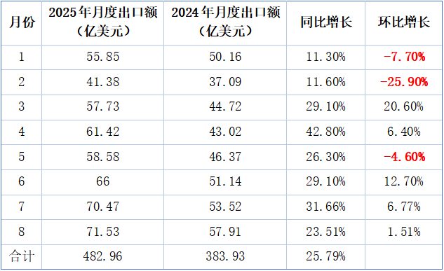 表一2025年1—8月鋰離子電池出口量月度變化情況