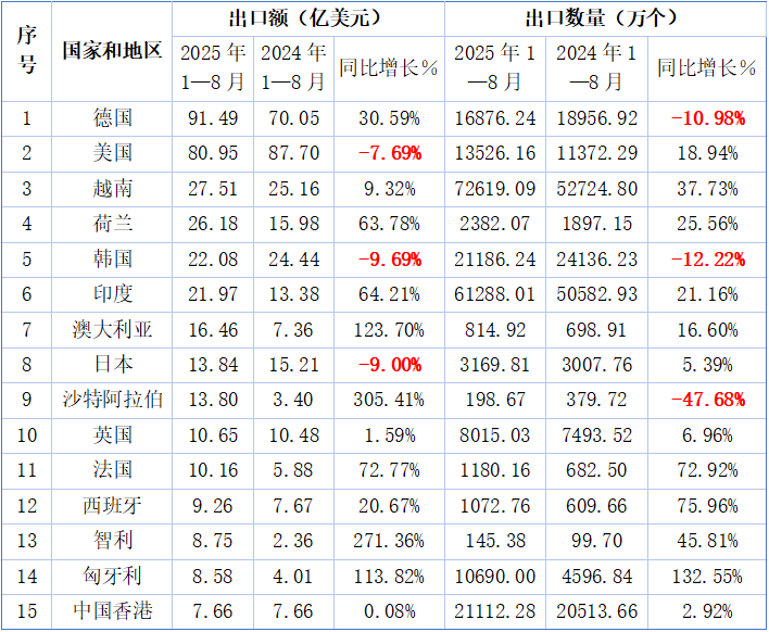 德國(guó)從5月份開始已經(jīng)取代美國(guó)成為我國(guó)鋰離子電池第一大出口市場(chǎng),2025年1—8月出口金額為80.95億美元,同比增長(zhǎng)30.59%,占我國(guó)鋰離子出口總額的18.9%。第二大市場(chǎng)為美國(guó),1-8月出口總金額為74.18億美元,同比下降7.69%,占我國(guó)鋰離子電池出口額的16.8%。越南為第三大出口市場(chǎng),出口金額為27.51億美元,同比增長(zhǎng)9.32%,占我國(guó)鋰離子電池出口額的5.6%。前十大出口國(guó)家中,同比增幅最大的國(guó)家有沙特阿拉伯、智利、澳大利亞。