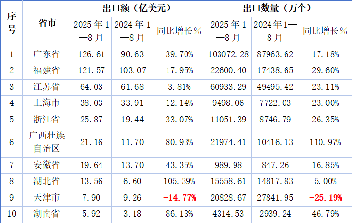 2025年1—8月出口金額增幅最大的三個(gè)省分別是湖北省、湖南省、廣西壯族自治區(qū),出口額分別增長(zhǎng)105.39%、86.13%和80.93%。出口數(shù)量增幅最大的三個(gè)省市分別為廣西壯族自治區(qū)、湖南省、福建省,出口數(shù)量分別增長(zhǎng)了10.97%、46.79%和29.6%。