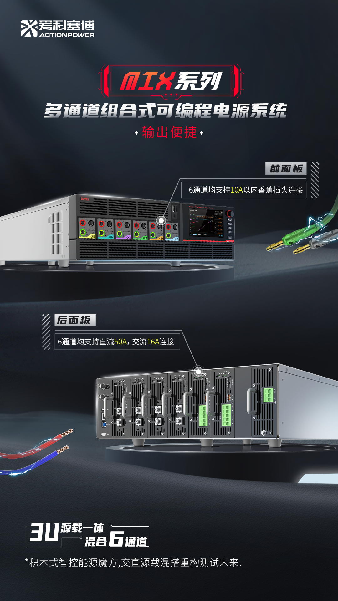 愛科MIX系列最核心的優(yōu)勢在于其“一機多能”的靈活性。6個通道插槽支持AC/DC模塊的任意組合與自由混插,用戶可以像搭積木一樣,根據(jù)被測物(DUT)的需求即時定制測試平臺。