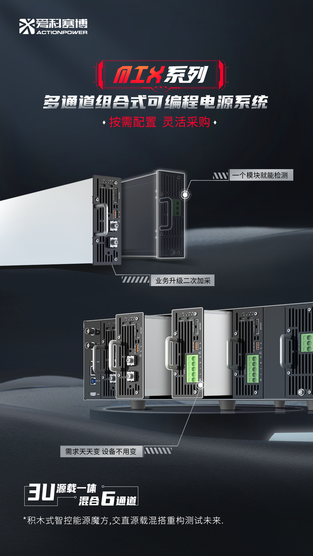愛科賽博推出的愛科MIX系列多通道組合式可編程電源系統(tǒng),帶來的不僅是性能升級,更是一場測試理念的革命性變革。其核心思想在于:用一臺標準3U機箱,終結(jié)過去由多臺獨立單通道電源拼湊組成的混亂局面。