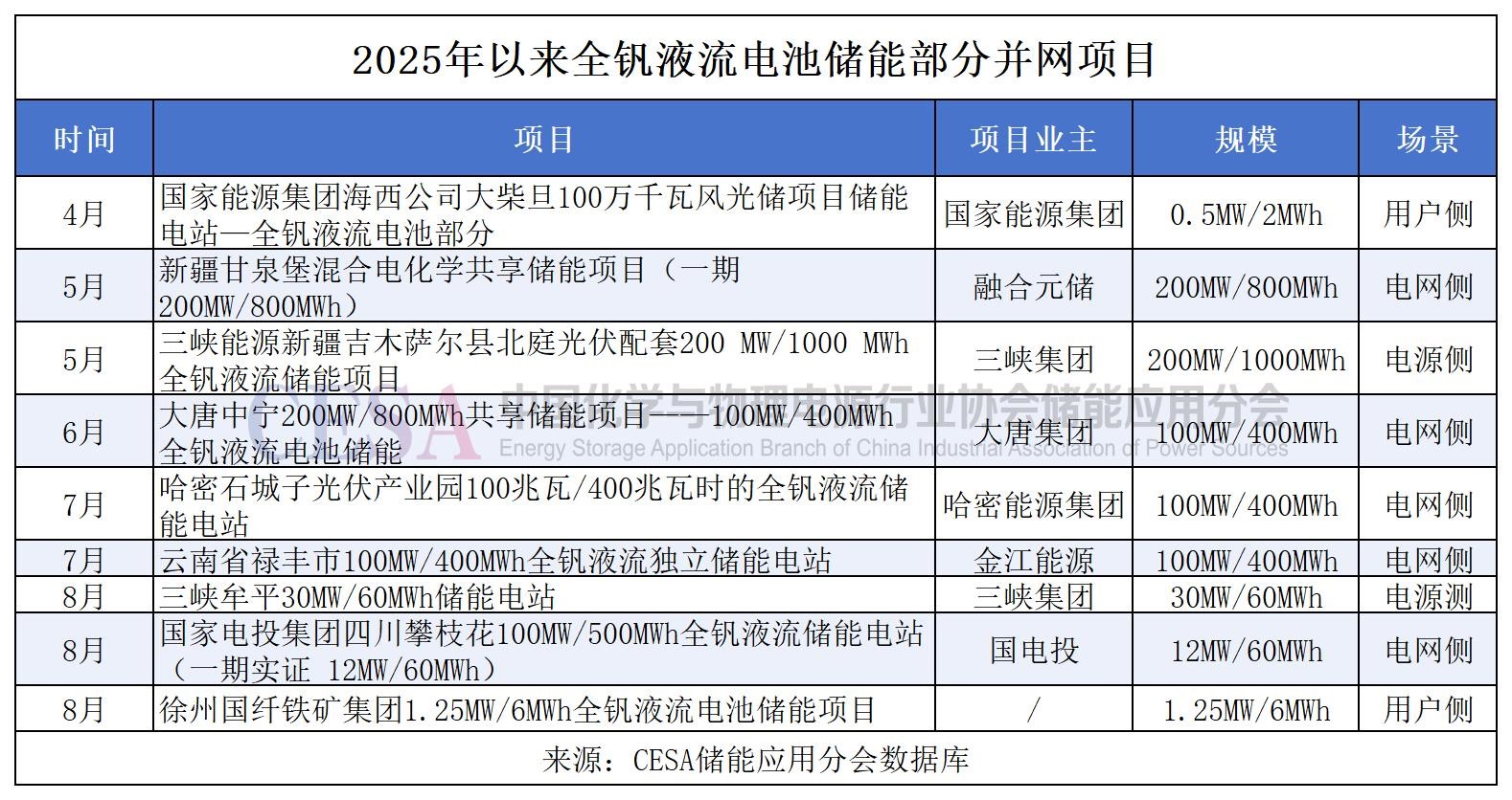 2025年以來,全釩液流電池的規(guī)?;瘧?yīng)用加速,據(jù)CESA儲能應(yīng)用分會產(chǎn)業(yè)數(shù)據(jù)庫不完全統(tǒng)計(jì),截至8月底,液流電池儲能并網(wǎng)規(guī)模達(dá)0.59GW/3.32GWh,一個明顯特征是大型標(biāo)桿項(xiàng)目的密集落地,凸顯全釩液流電池儲能支撐百兆瓦級規(guī)模應(yīng)用的能力進(jìn)一步夯實(shí)。
