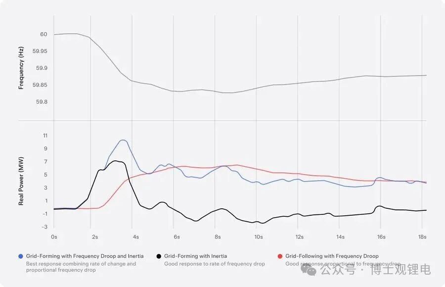 構(gòu)網(wǎng)型逆變器可通過(guò)下垂控制和虛擬慣性提供頻率支持。在同步發(fā)電機(jī)減少導(dǎo)致系統(tǒng)機(jī)械慣性降低的背景下,這一能力尤為關(guān)鍵。在通過(guò)虛擬慣性提供頻率支持時(shí),構(gòu)網(wǎng)型逆變器會(huì)根據(jù)頻率變化調(diào)整其功率輸出——其對(duì)頻率變化率的響應(yīng)近乎瞬時(shí)且按比例實(shí)現(xiàn),有助于減少電力系統(tǒng)頻率波動(dòng),并在擾動(dòng)期間穩(wěn)定電網(wǎng)。跟網(wǎng)型逆變器也可提供頻率支持,但無(wú)法達(dá)到構(gòu)網(wǎng)型逆變器與同步發(fā)電機(jī)相同的亞周期響應(yīng)速度。