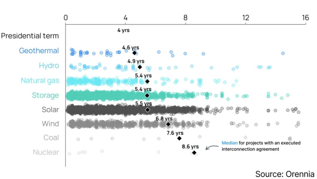 [按能源類型分類的并網(wǎng)隊(duì)列項(xiàng)目時長分布圖。來源:Orennia]