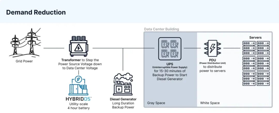 電池儲能系統(tǒng)(BESS)使靈活并網(wǎng)可行且可靠。通過電表后端部署公用事業(yè)級電池,數(shù)據(jù)中心可在電網(wǎng)峰值時切換儲能,滿足削減要求且保障運(yùn)行時長與電能質(zhì)量。