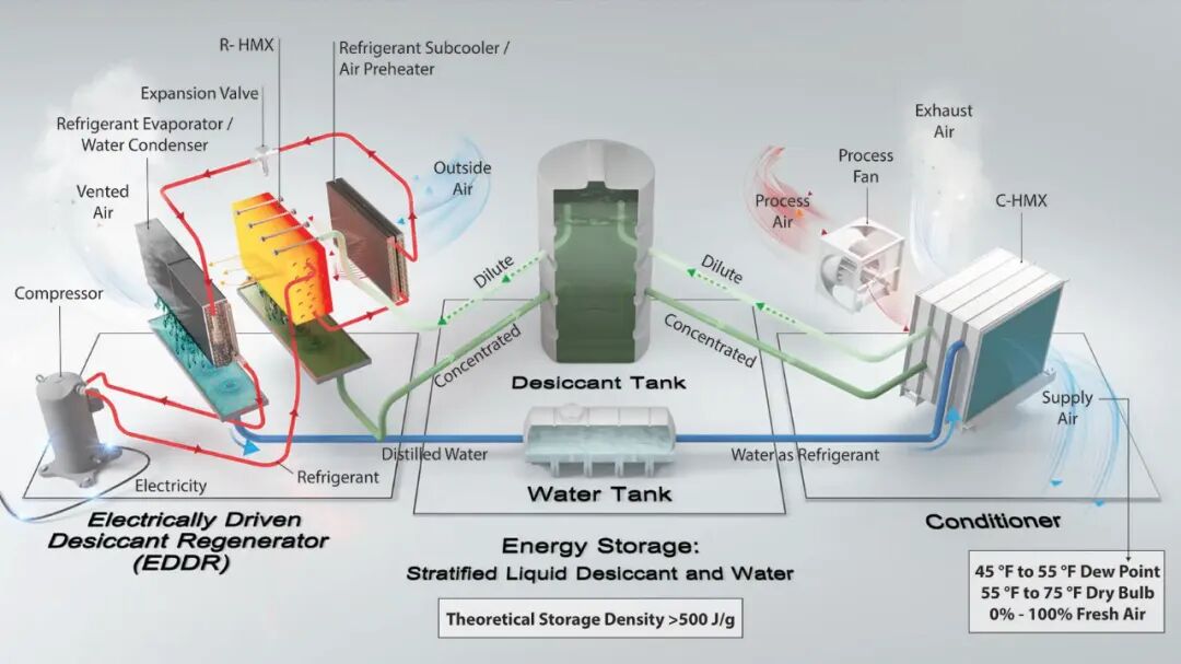 (系統(tǒng)示意圖說(shuō)明:ESEAC系統(tǒng)包含三大創(chuàng)新子系統(tǒng):1)電動(dòng)干燥劑再生器消耗系統(tǒng)90%以上電量,將稀釋干燥劑分離為蒸餾水和濃縮液體;2)儲(chǔ)能罐儲(chǔ)存分離后的液體;3)調(diào)節(jié)器使用儲(chǔ)存液體實(shí)現(xiàn)空氣干冷處理,僅需少量電力驅(qū)動(dòng)泵和風(fēng)機(jī)。處理后干燥劑稀釋液返回儲(chǔ)罐。圖表由NREL喬舒亞·鮑爾制作)