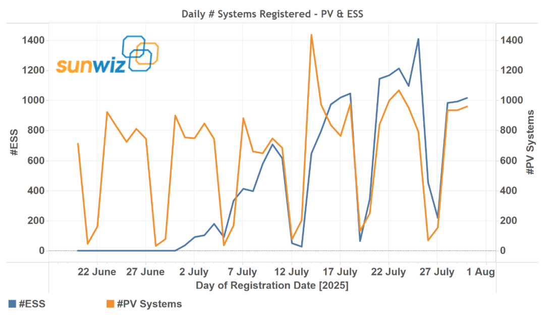 尤其在7月15日至21日這一周,這一比例飆升至每100個光伏系統(tǒng)安裝137個電池。