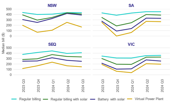 而安裝屋頂太陽能的家庭電費中位數(shù)可減少約18%(每年僅需1279澳元),而同時安裝太陽能和家用電池的家庭電費中位數(shù)可減少約40%(每年僅需936澳元)。