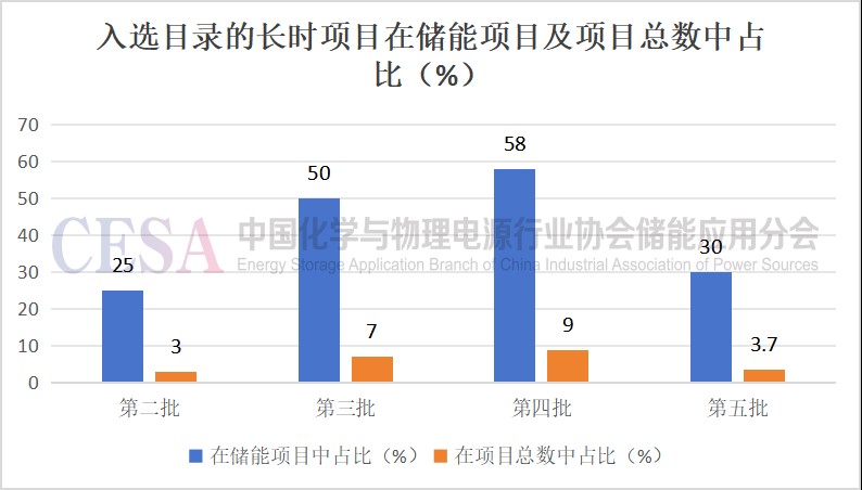 其中,首批名單無長時儲能入選,從第二批的兩項突破,再到第三批的四個項目入選,直至第四批的七個項目,長時儲能相關項目的數(shù)量在該名單中持續(xù)攀升,在入選的儲能項目中的占比一度達到58%。