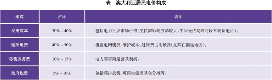 促進屋頂光伏快速發(fā)展的直接原因是用戶對于降低電費支出的訴求。近年來,受國際能源價格上漲等因素影響,澳大利亞發(fā)電成本快速上升。與此同時,終端電價結(jié)構(gòu)中輸配電價占比很高,進一步刺激用戶通過自發(fā)自用電量來避免支付高額過網(wǎng)費。表中展示了居民電價的構(gòu)成,其中輸配電費占比最高。具體來看,澳大利亞居民平均電價為0.3~0.4澳元/千瓦時,工商業(yè)電價略低,為0.25~0.35澳元/千瓦時。在這樣的電價結(jié)構(gòu)下,居民家庭年均電費約為1500~2000澳元,而安裝屋頂光伏系統(tǒng)后,平均每套系統(tǒng)每年可為家庭節(jié)省超過1500澳元,經(jīng)濟效益顯著。因此,在澳大利亞許多地區(qū),僅需3~5年節(jié)省的電費即可覆蓋光伏系統(tǒng)的初始投資成本。