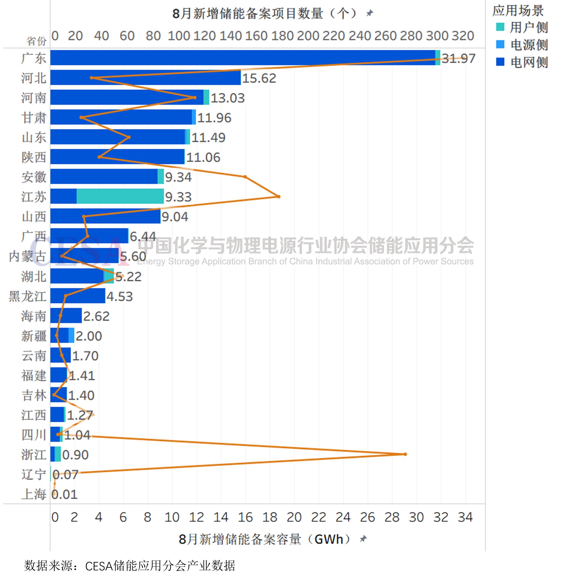 圖 2025年8月各省儲能新增備案項目數(shù)量及容量
