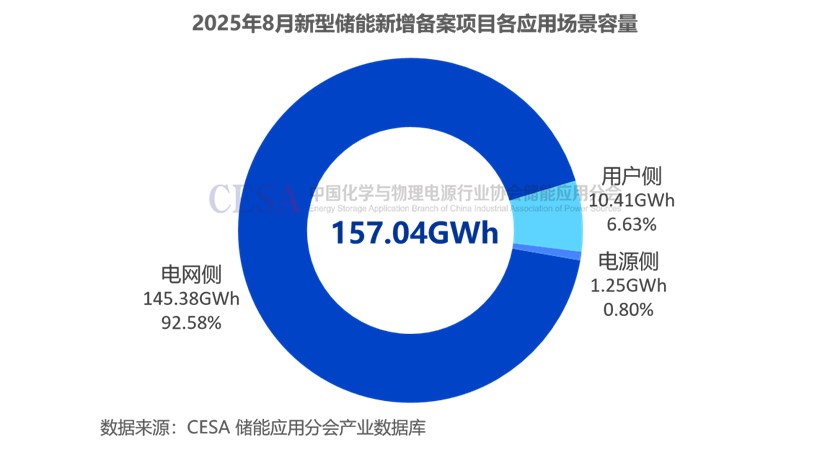 2025年8月,國內(nèi)電網(wǎng)側(cè)儲能新增299個備案項目,總規(guī)模達56.86GW/145.38GWh,占比91.44%(功率)/92.58%(容量),已披露計劃投資金額達947億元。