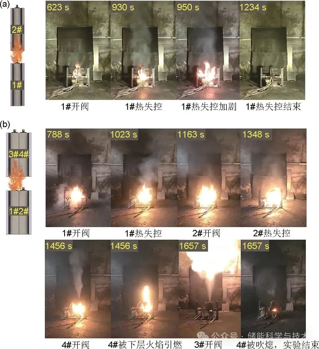 本工作通過(guò)開展雙層磷酸鐵鋰電池模組火蔓延實(shí)驗(yàn),設(shè)計(jì)雙層電池?cái)?shù)量分別為1節(jié)、2節(jié)和3節(jié)的實(shí)驗(yàn)方案,研究了100 Ah磷酸鐵鋰電池火蔓延特性及觸發(fā)過(guò)程的能量傳遞機(jī)制。以下為本工作主要研究結(jié)論: