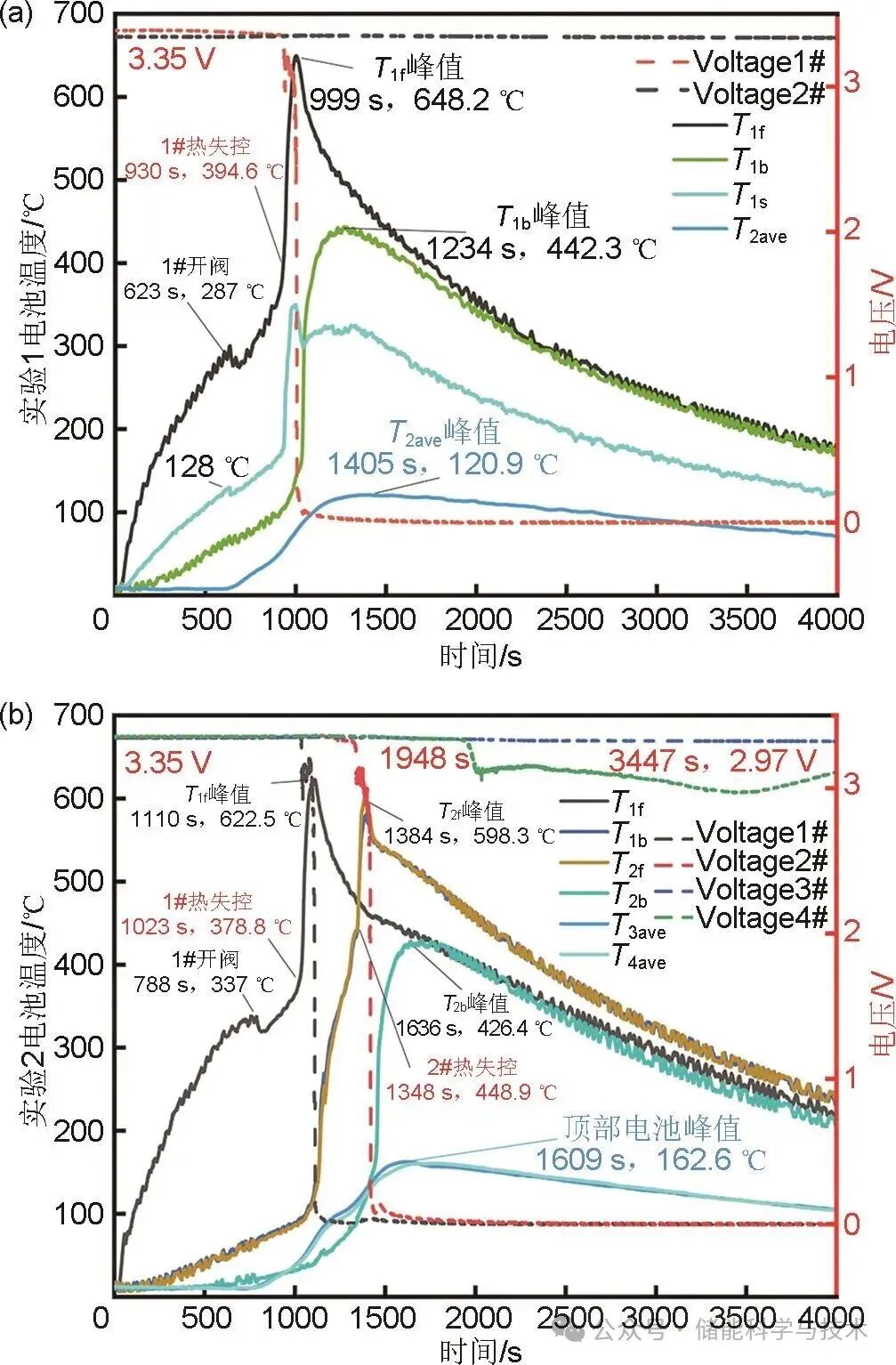 圖6(b)展示了實(shí)驗(yàn)2中各節(jié)電池的溫度變化。1#電池于788 s發(fā)生開閥,此時(shí)正面(加熱面)溫度T1f為337 ℃,當(dāng)加熱過(guò)程進(jìn)行到1023 s,1#電池發(fā)生熱失控,此時(shí)T1f為378.8 ℃,并于1110 s達(dá)到峰值622.5 ℃。1348s時(shí)2#電池發(fā)生熱失控,此時(shí)T2f為448.9 ℃,并于1384 s達(dá)到峰值598.3 ℃。T2b于1636 s達(dá)到峰值426.4 ℃,整個(gè)熱失控過(guò)程持續(xù)了613 s,1#與2#的熱蔓延時(shí)間間隔為325 s。圖6(b)中記錄了頂部3#電池和4#電池的平均溫度T3ave和T4ave,2條溫度曲線幾乎重合,說(shuō)明底部電池對(duì)頂部電池的加熱效應(yīng)是幾乎相同的,頂部2節(jié)電池的平均溫度于1609 s達(dá)到峰值162.6 ℃。整個(gè)過(guò)程中,1#電池與2#電池的電壓在熱失控時(shí)從3.35 V驟降到1 V以下,3#電池電壓一直沒有發(fā)生波動(dòng),而4#電池的電壓在1948 s時(shí)發(fā)生下降,于3447 s降低至2.97 V后發(fā)生回升,這是由于電池受到加熱發(fā)生局部?jī)?nèi)短路,但后續(xù)失去了加熱源,并受到熱對(duì)流和熱輻射的散熱影響,局部?jī)?nèi)短路停止,沒有進(jìn)一步發(fā)生熱失控。