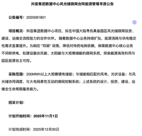 大型互聯(lián)網(wǎng)公司正從傳統(tǒng)的“電力消費者”向“能源基礎(chǔ)設(shè)施參與者”轉(zhuǎn)型,主動布局可再生能源和儲能系統(tǒng)。2025年9月,抖音集團發(fā)布了其數(shù)據(jù)中心‘風(fēng)光儲微網(wǎng)’合同能源管理尋源公告,擬采購200 MWh以上的大規(guī)模鋰電儲能系統(tǒng),并配套風(fēng)電、光伏設(shè)備與微網(wǎng)控制系統(tǒng),以實現(xiàn)風(fēng)光儲能協(xié)同調(diào)度和對外電網(wǎng)的柔性互動。業(yè)內(nèi)評論認(rèn)為,此舉在互聯(lián)網(wǎng)行業(yè)具有里程碑意義:一方面表明大型互聯(lián)網(wǎng)公司正從被動的電力用戶轉(zhuǎn)變?yōu)榉e極的能源管理者和貢獻(xiàn)者;另一方面也意味著“風(fēng)光儲微網(wǎng)”解決方案將成為未來算力基礎(chǔ)設(shè)施建設(shè)的標(biāo)配選項之一。