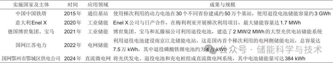 各項(xiàng)法規(guī)與標(biāo)準(zhǔn)對(duì)退役電池回收、運(yùn)輸、評(píng)估、重組與報(bào)廢等多個(gè)環(huán)節(jié)進(jìn)行規(guī)范,隨著政策框架的完善,RB回收與梯次利用產(chǎn)業(yè)正在朝著智能、綠色、可持續(xù)的方向發(fā)展。在國(guó)內(nèi)外政策的支持下,RB的梯次利用技術(shù)逐步成熟,催生了儲(chǔ)能電站、通信基站等多個(gè)應(yīng)用項(xiàng)目。表1中列舉了近年來(lái)部分國(guó)內(nèi)外梯次利用工程實(shí)例。