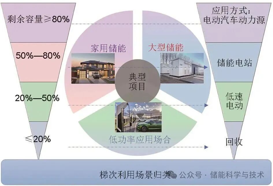 RB不僅能有效實(shí)現(xiàn)電力的削峰填谷、事故備用等功能,還提升了資源的利用效率,推動(dòng)了能源系統(tǒng)的可持續(xù)發(fā)展。此外,RB在家庭儲(chǔ)能系統(tǒng)、城市照明、低速電動(dòng)車等領(lǐng)域的應(yīng)用也取得了顯著進(jìn)展,展現(xiàn)了其廣泛的適用性與潛力。圖2對(duì)典型梯次利用場(chǎng)景進(jìn)行歸類。