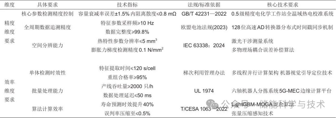 退役電池特征指標(biāo)提取的精度與效率已成為制約梯次利用安全性的核心瓶頸。當(dāng)前主流標(biāo)準(zhǔn)要求容量檢測(cè)誤差嚴(yán)格控制在±1.5%以內(nèi),但面對(duì)退役電池離散性高及全溫度工況(-20~55 ℃)漂移問題,亟需突破三重技術(shù)壁壘:①多物理場(chǎng)特征耦合檢測(cè),實(shí)現(xiàn)熱-電-力參數(shù)10 kHz同步采樣及5 mm3微區(qū)空間解析;②異構(gòu)數(shù)據(jù)實(shí)時(shí)處理,通過(guò)邊緣推理引擎(<50 ms延遲)完成16維特征張量的動(dòng)態(tài)降噪;③動(dòng)態(tài)衰減建模,利用遷移學(xué)習(xí)算法補(bǔ)償80%以上的工況偏移誤差。國(guó)際對(duì)標(biāo)顯示,歐盟電池護(hù)照要求的全壽命數(shù)據(jù)追溯能力需匹配≥12維特征/秒的提取頻率,而美國(guó)UL 1974的等效循環(huán)模型更依賴?yán)匣窂筋A(yù)測(cè)精度(RMSE<0.8%)。這表明退役電池特征指標(biāo)的提取過(guò)程中,效率與精度難以兼顧,因而將其分為“側(cè)重于效率”和“側(cè)重于精度”,剖析兩者各自獨(dú)立卻又聯(lián)系的部分,以期為我國(guó)梯次利用技術(shù)發(fā)展提供理論參考。