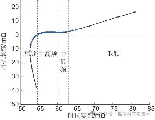 電化學(xué)阻抗譜(electrochemical impedance spectroscopy, EIS)主要用于提取電池的阻抗指標(biāo),揭示電池內(nèi)部的老化跡象、極化效應(yīng)以及電解質(zhì)和電極的狀態(tài)變化,從而有效地評(píng)估RB的衰退程度和失效模式,并且其具有非破壞性、無(wú)損性,成為RB阻抗指標(biāo)提取的主要手段。EIS提取特定頻率下的阻抗值作為評(píng)估電池SOH的特征指標(biāo)。傳統(tǒng)的EIS測(cè)試消耗時(shí)間長(zhǎng)、成本高,通過(guò)改進(jìn)測(cè)試方法以及與電脈沖等其他測(cè)試方法相結(jié)合,EIS能夠契合特征指標(biāo)提取對(duì)效率的要求。如圖3為典型的EIS曲線,主要包括4個(gè)部分:高頻區(qū)域、中高頻區(qū)域、中頻區(qū)域、低頻區(qū)域。