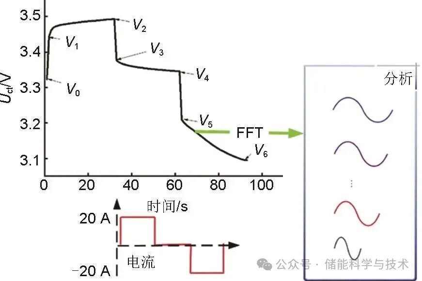 文獻(xiàn)[36]提出了四脈沖測(cè)試法,分析每個(gè)脈沖的起始電壓、結(jié)束電壓、脈沖跌落電壓以及脈沖起始與結(jié)束瞬間等效內(nèi)阻與SOH的變化關(guān)系,在短時(shí)脈沖后進(jìn)行一次EIS測(cè)試就可提取特征指標(biāo)。文獻(xiàn)[37]僅通過(guò)一次HPPC測(cè)試提取電池的OCV。在此基礎(chǔ)上,如圖4所示,文獻(xiàn)[38]對(duì)磷酸鐵鋰電池施加30秒正向電流脈沖,靜置30秒后再施加30秒負(fù)向電流脈沖,在此過(guò)程中快速提取動(dòng)態(tài)電壓,并將動(dòng)態(tài)電壓進(jìn)行傅里葉分解,分析其在不同頻率下的變化幅值,作為用于估計(jì)電池SOH的特征指標(biāo)。文獻(xiàn)[39]則將脈沖下的電壓響應(yīng)曲線中的轉(zhuǎn)折點(diǎn)視作特征點(diǎn),通過(guò)手動(dòng)提取減少數(shù)據(jù)維度,僅用21個(gè)特征點(diǎn)作為特征指標(biāo)用于隨機(jī)森林機(jī)器學(xué)習(xí)模型的輸入,大大提高了提取數(shù)據(jù)的效率。
