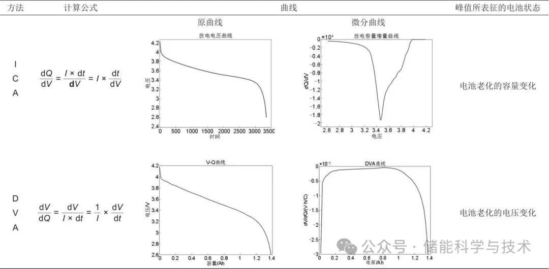 相比于從電壓曲線和脈沖曲線中提取鋰離子電池特征指標(biāo),微分曲線方法計(jì)算量小、電參數(shù)意義可解釋性強(qiáng)、成本小且實(shí)施簡(jiǎn)單。該方法通過(guò)將電池電壓、容量和電流等曲線中平臺(tái)期平緩的變化通過(guò)微分轉(zhuǎn)化為峰值,不同循環(huán)下微分曲線峰值數(shù)據(jù)能夠表征電池老化規(guī)律,更易辨識(shí),從而提高了退役鋰離子電池特征指標(biāo)的篩選效率。如表3,基于微分曲線的特征指標(biāo)提取方法主要分為容量增量法(incremental capacity analysis, ICA)和差分電壓法(differential voltage analysis, DVA)。