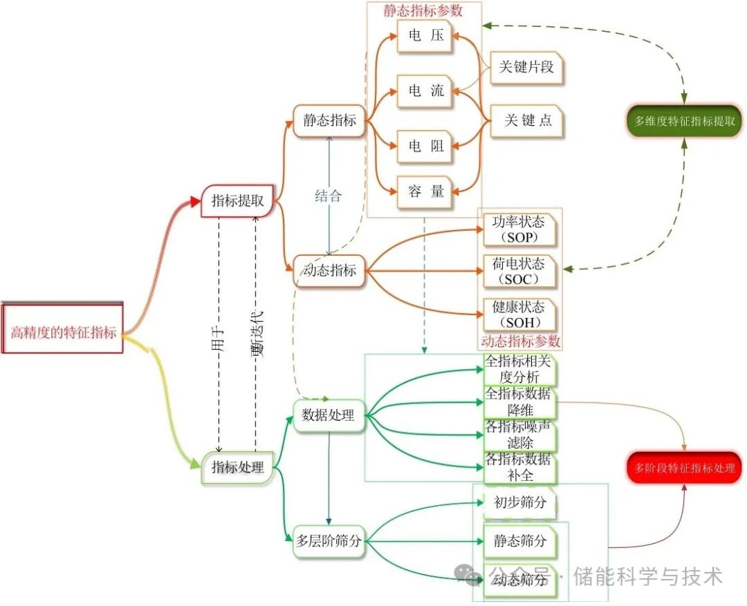 精度是實(shí)現(xiàn)梯次利用安全性的必要條件。退役電池來(lái)自不同場(chǎng)景,經(jīng)歷不同程度老化,大量電池之間存在較強(qiáng)不一致性,提升特征指標(biāo)提取的精度有助于提高梯次利用的安全與可靠性。側(cè)重于精度的特征指標(biāo)提取和處理方法主要分為多維度特征指標(biāo)提取和多層階特征指標(biāo)的應(yīng)用,如圖5所示。