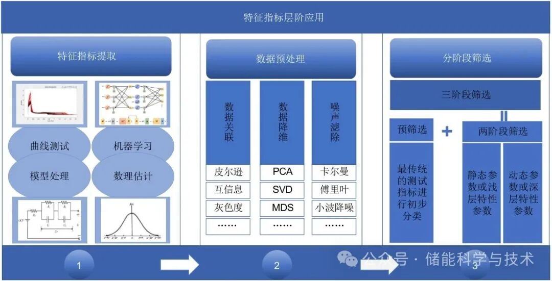 (2)提高特征指標(biāo)提取的效率,可以從測(cè)試方法入手,也可以從測(cè)試指標(biāo)的選擇上入手。對(duì)于傳統(tǒng)的特征指標(biāo),改進(jìn)測(cè)試的方案可降低測(cè)試的時(shí)間,EIS成為RB模組層面篩分的常用手段。對(duì)于測(cè)試曲線處理,數(shù)據(jù)驅(qū)動(dòng)算法和數(shù)據(jù)處理的方法選取部分特征指標(biāo),實(shí)現(xiàn)了以局部評(píng)估整體、以過(guò)程預(yù)估結(jié)果的目標(biāo)。