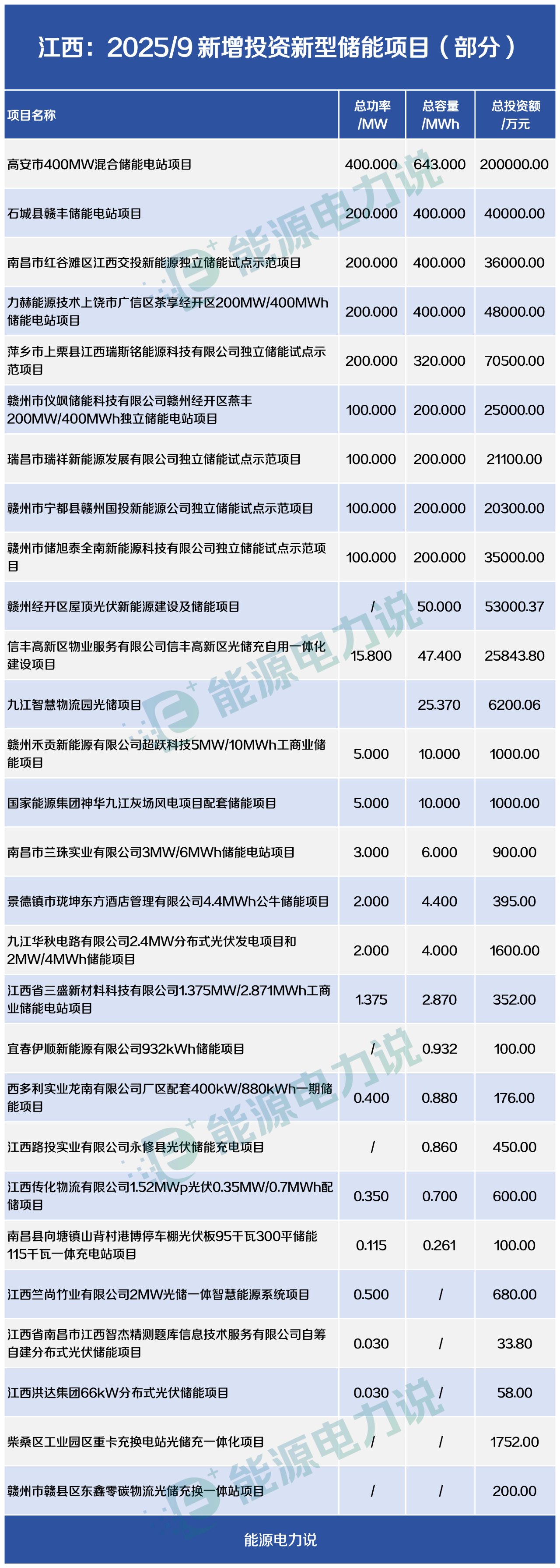 中國儲能網(wǎng)訊:據(jù)能源電力說統(tǒng)計,2025年9月下半月,江西新增投資新型儲能項目28個,整體備案規(guī)模超1635.600MW/3126.673MWh,總投資約59.03億元。