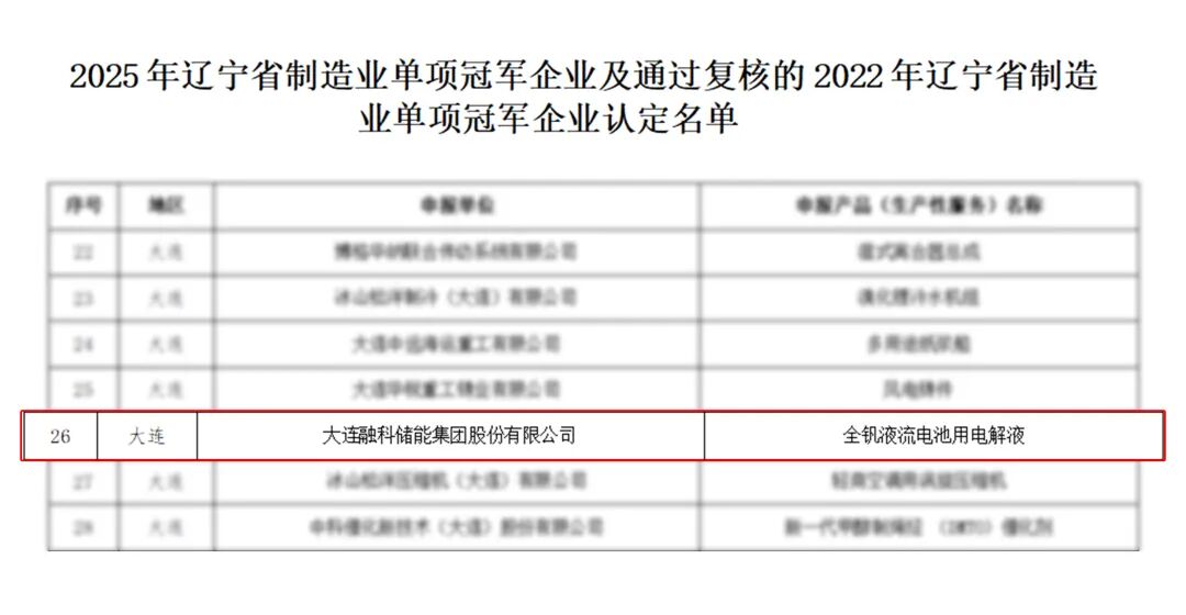 中國(guó)儲(chǔ)能網(wǎng)訊:近日,遼寧省工業(yè)和信息化廳公示了2025年遼寧省制造業(yè)單項(xiàng)冠軍企業(yè)及通過復(fù)核的2022年遼寧省制造業(yè)單項(xiàng)冠軍企業(yè)認(rèn)定名單,大連融科儲(chǔ)能集團(tuán)股份有限公司(以下簡(jiǎn)稱“融科儲(chǔ)能”)憑借釩液流電池用電解液方面的卓越表現(xiàn),成功入選2025年遼寧省制造業(yè)單項(xiàng)冠軍企業(yè)名單,這一榮譽(yù)標(biāo)志著融科儲(chǔ)能在釩液流電池用電解液領(lǐng)域的卓越實(shí)力,以及在制造業(yè)細(xì)分領(lǐng)域的領(lǐng)先地位。